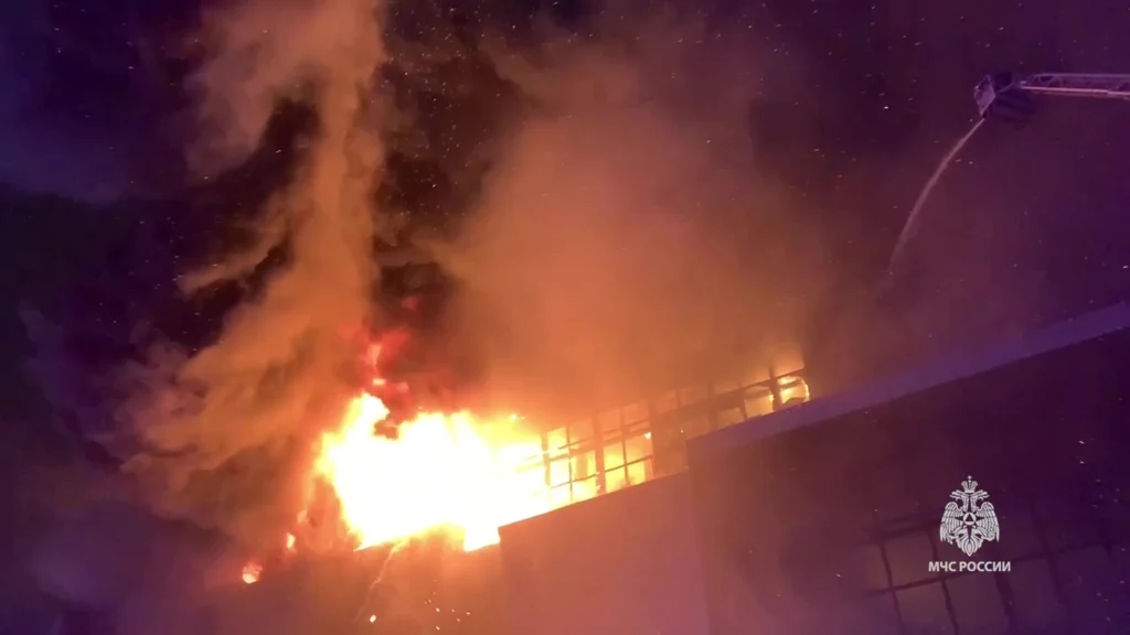 Rusya Acil Durumlar Bakanlığı’na bağlı ekipler, saldırı sırasında çıkan yangın sonrasında enkaz kaldırma çalışmalarına devam ediyor. Görüntüler, yangının boyutunu ortaya koydu.