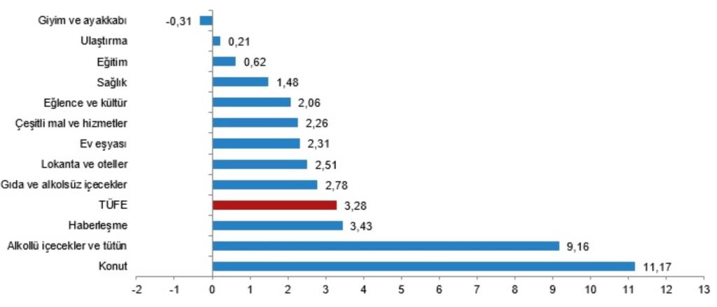 Bir önceki yılın aynı ayına göre en az artış gösteren ana grup yüzde 37,54 ile konut oldu. Buna karşılık, bir önceki yılın aynı ayına göre artışın en yüksek olduğu ana grup ise yüzde 92,86 ile lokanta ve oteller oldu.