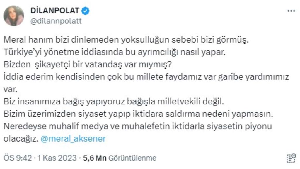 Polat’ın hesabından daha sonra da İYİ Parti Genel Başkanı Meral Akşener’in grup toplantısında “Cumhuriyet vizyonumuzun, en büyük değer olarak gördüğü gençlerimizi böylesi bir çaresizliğe, terk etmeyeceğiz. Her biri Dilan Polat, Engin Polat’a dönmüş çocuklar” sözlerine de cevap verilerek “Biz insanımıza bağış yapıyoruz bağışla milletvekili değil. Bizim üzerimizden siyaset yapıp iktidara saldırma nedeni yapmasın. Neredeyse muhalif medya ve muhalefetin iktidarla siyasetin piyonu olacağız” ifadelerine yer verilmişti.