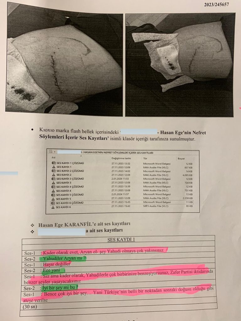 Savcılık soruşturma dosyasına, 5 ayrı ses kaydının çözümü girdi. Hasan Ege K.’nin, F. B.’ye yönelik “Türkiye’nin, belli bir noktadan sonraki Doğusu olduğu gibi ateşe verilse…” diyor. Hasan Ege K., F. B.’nin etnik kimliği için “Alt ırksınız. İtlaf edilmeniz lazım. Köle olduğunuzu kabullenmelisiniz. İtaat etmek zorundasınız. Seni bu odadan istemiyoruz. Buradan gitmezsen seni öldürürüz ” ifadelerini kullanıyor.