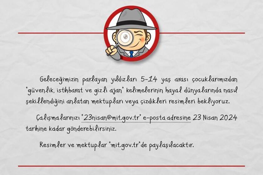 MİT, resmi internet sitesinden yayımladığı duyuru ile 23 Nisan Ulusal Egemenlik ve Çocuk Bayramı dolayısıyla çocuklardan “güvenlik”, “istihbarat” ve “gizli ajan” kelimelerini resimle ya da mektupla kağıda dökmelerini istedi.