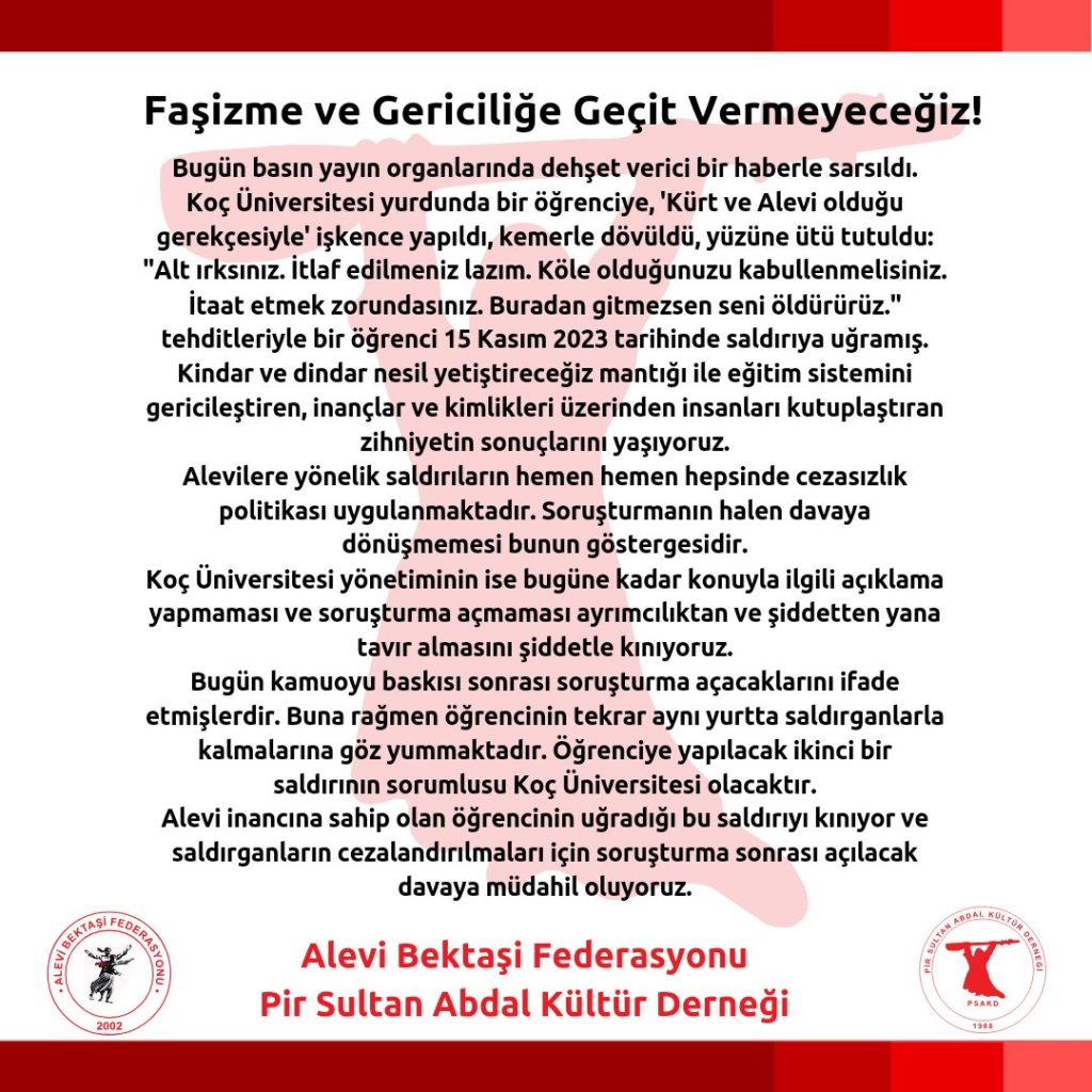 Pir Sultan Abdal Kültür Derneği, Koç Üniversitesi yurdunda yaşanan dehşet verici ırkçı ve mezhepçi olaya ilişkin bir basın açıklaması yayınladı.