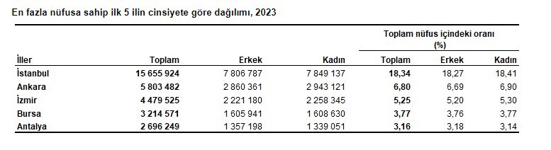 İstanbul’un nüfusu, bir önceki yıla göre 252 bin 27 kişi azalarak 15 milyon 655 bin 924 kişi oldu. Türkiye nüfusunun yüzde 18,34’ünün ikamet ettiği İstanbul’u, 5 milyon 803 bin 482 kişi ile Ankara, 4 milyon 479 bin 525 kişi ile İzmir, 3 milyon 214 bin 571 kişi ile Bursa ve 2 milyon 696 bin 249 kişi ile Antalya izledi.