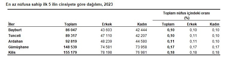Bayburt, 86 bin 47 kişi ile en az nüfusa sahip olan il oldu. Bayburt’u, 89 bin 317 kişi ile Dersim, 92 bin 819 kişi ile Ardahan, 148 bin 539 kişi ile Gümüşhane ve 155 bin 179 kişi ile Kilis takip etti.