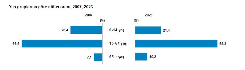 Çalışma çağı olarak tanımlanan 15-64 yaş grubundaki nüfusun oranı, 2007 yılında yüzde 66,5 iken 2023 yılında yüzde 68,3 oldu. Diğer yandan çocuk yaş grubu olarak tanımlanan 0-14 yaş grubundaki nüfusun oranı yüzde 26,4’ten yüzde 21,4’e gerilerken, 65 ve daha yukarı yaştaki nüfusun oranı ise yüzde 7,1’den yüzde 10,2’ye yükseldi.