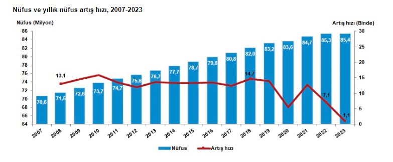 Yıllık nüfus artış hızı 2022 yılında binde 7,1 iken, 2023 yılında binde 1,1 oldu.