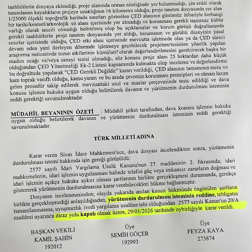 Sivas’ın Zara ilçesinde hayata geçirilmesi planlanan maden projelerine karşı bölge halkının ve çevre köylerin açtığı davalarda, mahkemeden beklenen durdurma kararı çıkmadı. Sivas İdare Mahkemesi, Dipsizgöl köyündeki selestit maden ocağı ve Şenyayla köyü mevkiindeki pomza arama projesi için yapılan yürütmeyi durdurma taleplerini oy birliğiyle reddetti. Mahkeme, idari işlemin uygulanması halinde telafisi güç zararların oluşması ve işlemin açıkça hukuka aykırı olması şartlarının birlikte gerçekleşmediğine hükmederek itiraz yolunu da kapalı tuttu.