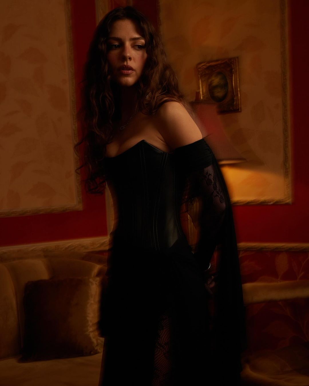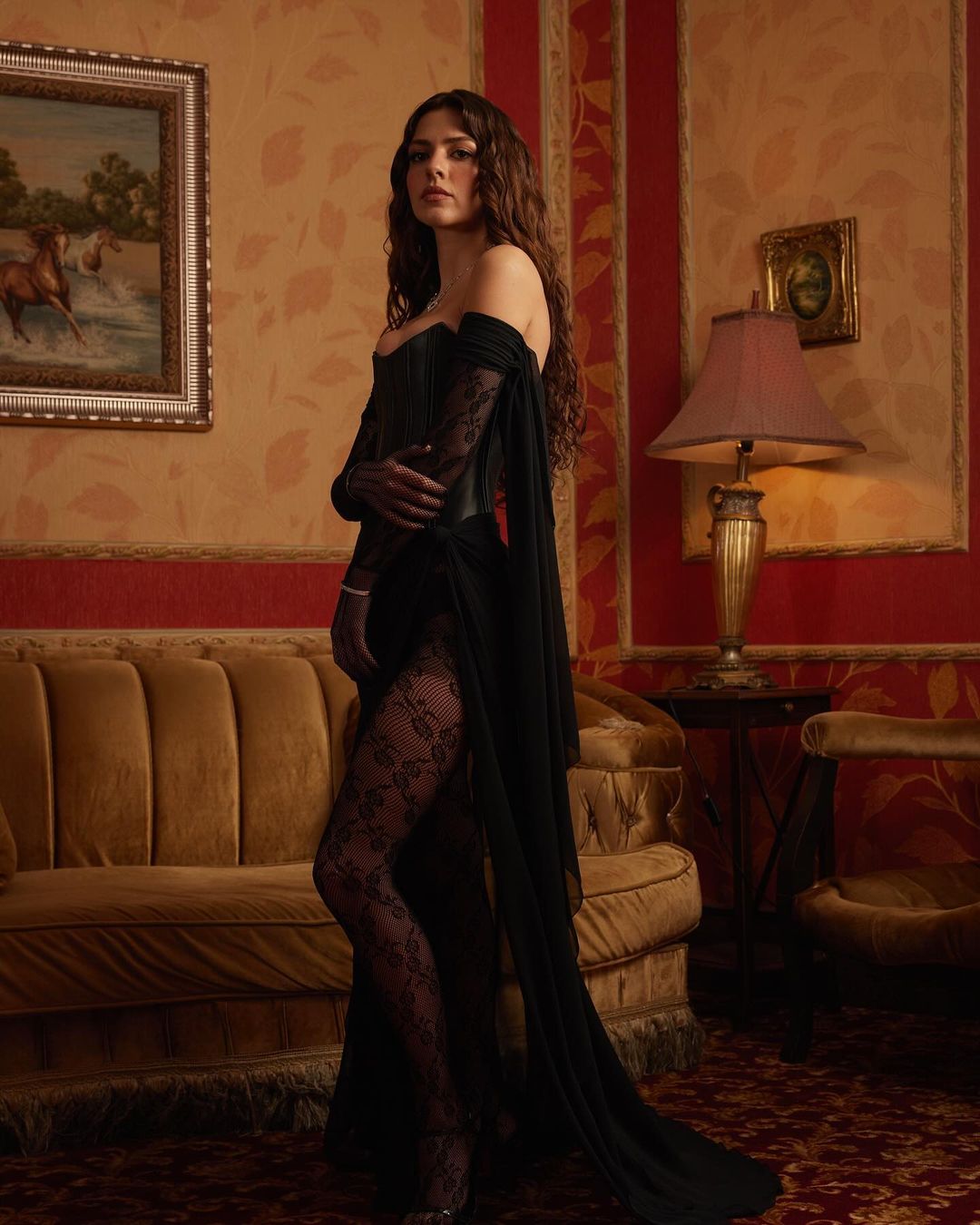 Korse detaylı göğüs dekolteli elbisesini dantel eldivenler ve dantel çorabıyla tamamlayan Aslıhan Malbora iddialı tarzıyla bakana bir daha baktırdı.